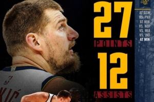 赛季个人第七次三双!掘金官方晒约基奇本场数据:27分10板12助