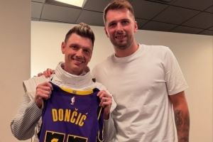 后街男孩(图中为Nick Carter)获赠东契奇的签名球衣,并合影留念。
