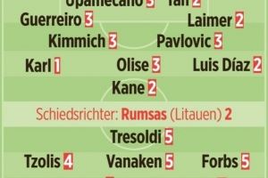 图片报为拜仁球员本场评分:卡尔最高,凯恩、迪亚斯、莱默尔高分