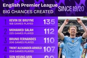 体育资讯11月19日讯 Squawka统计了2019-2020赛季以来球员在英超创造重大机会的次数,并列出榜单,德布劳内、萨拉赫、B费排名前三位。